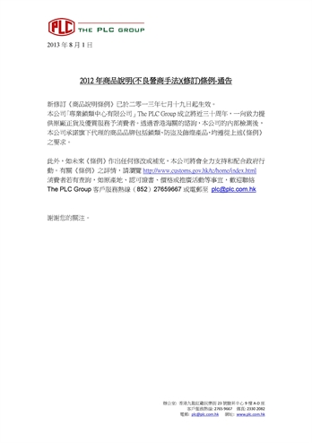 消費者若有查詢,如原產地、認可證書、價格或推廣活動等事宜,歡迎聯絡The PLC Group客戶服務熱線(852)27659667或